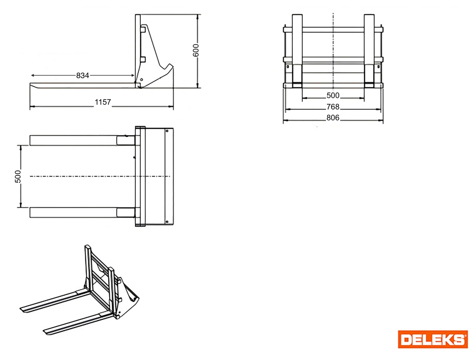 Les fourches DELEKS® pour les minidumpers V3000 et V3000H sont conçues pour la manutention de palettes et de charges compactes jusqu’à 120 kg. L’accessoire remplace le godet standard via une fixation boulonnée, sans modification structurelle de la machine.