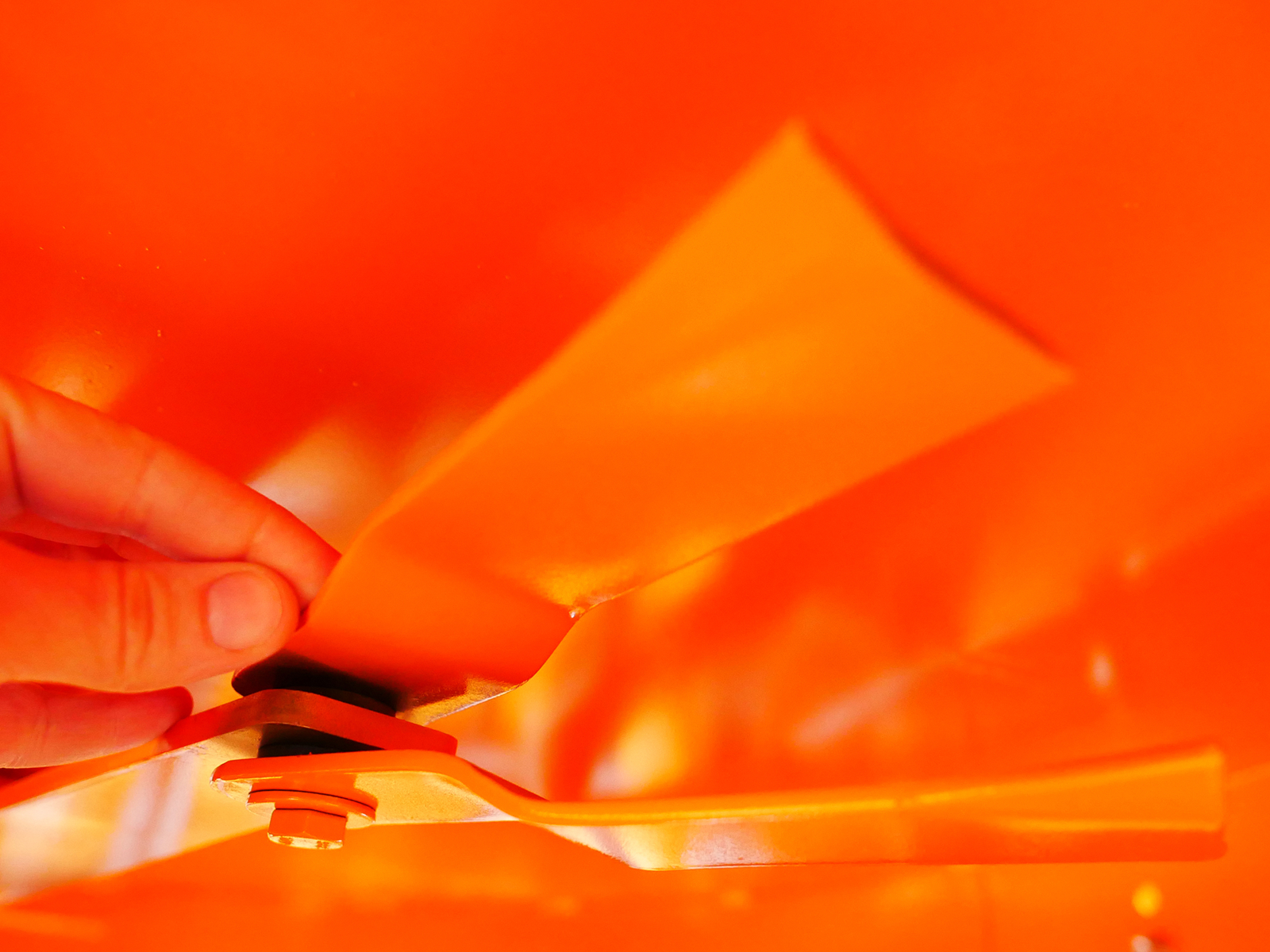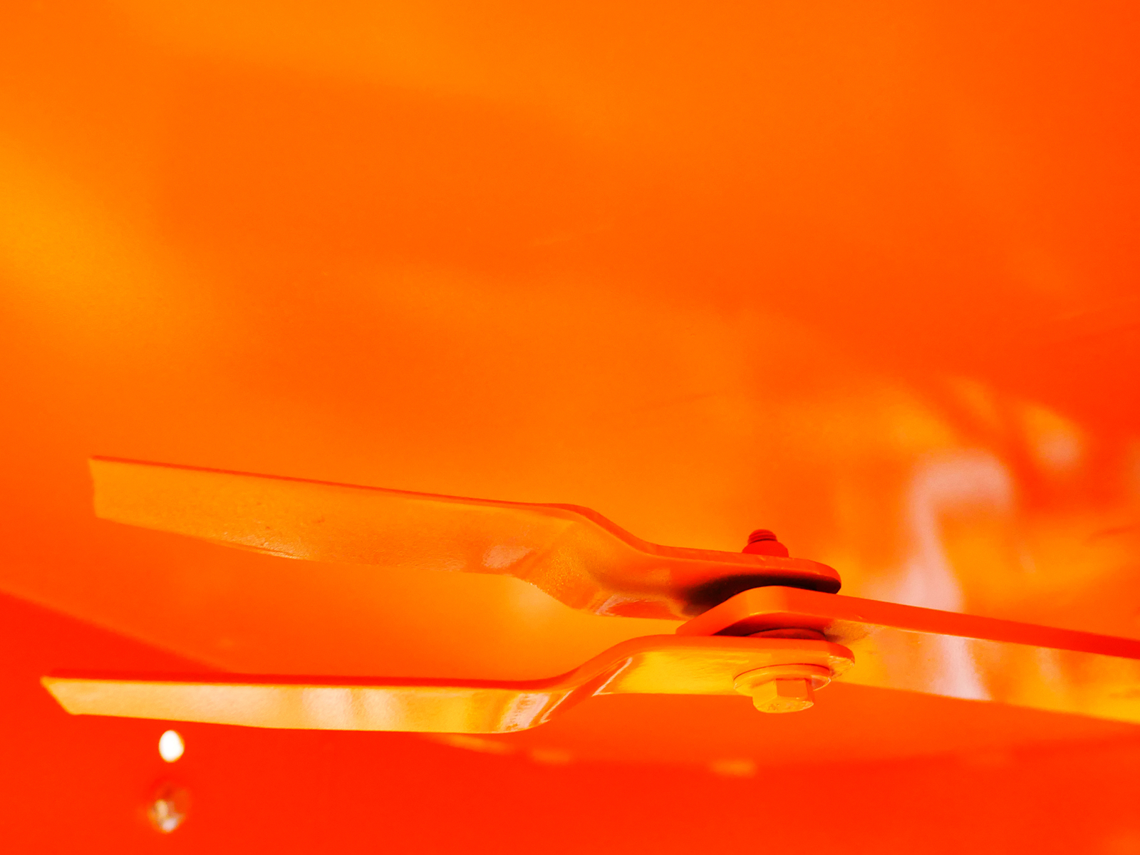 Système à double lame qui coupe simultanément la tige d'herbe en 3 sections, en la pulvérisant.