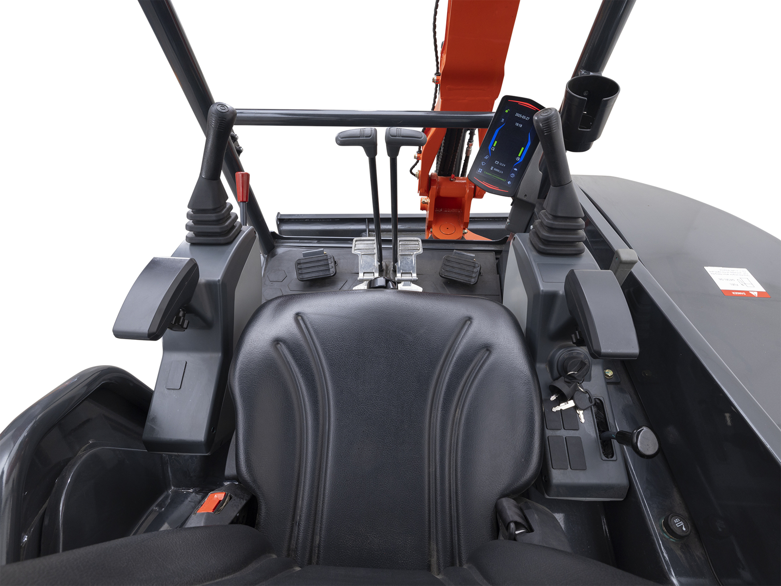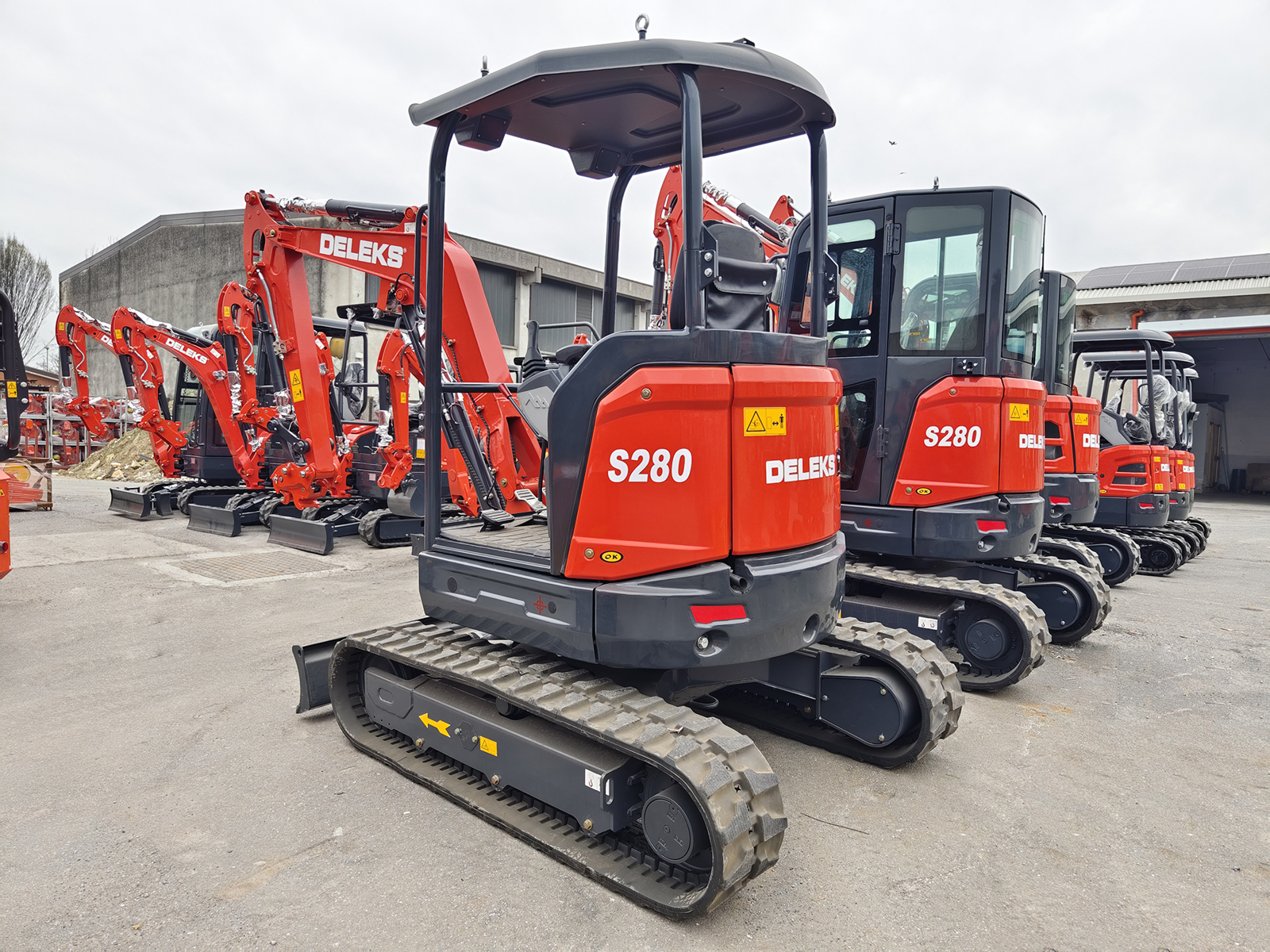 FERMERMini-pelle compacte DELEKS® S280-KUBOTA – 2.7 t — moteur Kubota D1105 Stage V à 3 cylindres (1123 cc), double vitesse jusqu’à 4 km/h, pompe hydraulique à pistons de 87 L/min avec contrôle Load Sensing, déport arrière nul, deux circuits AUX1–AUX2, bras déporté et valve de sécurité ISO 8643.