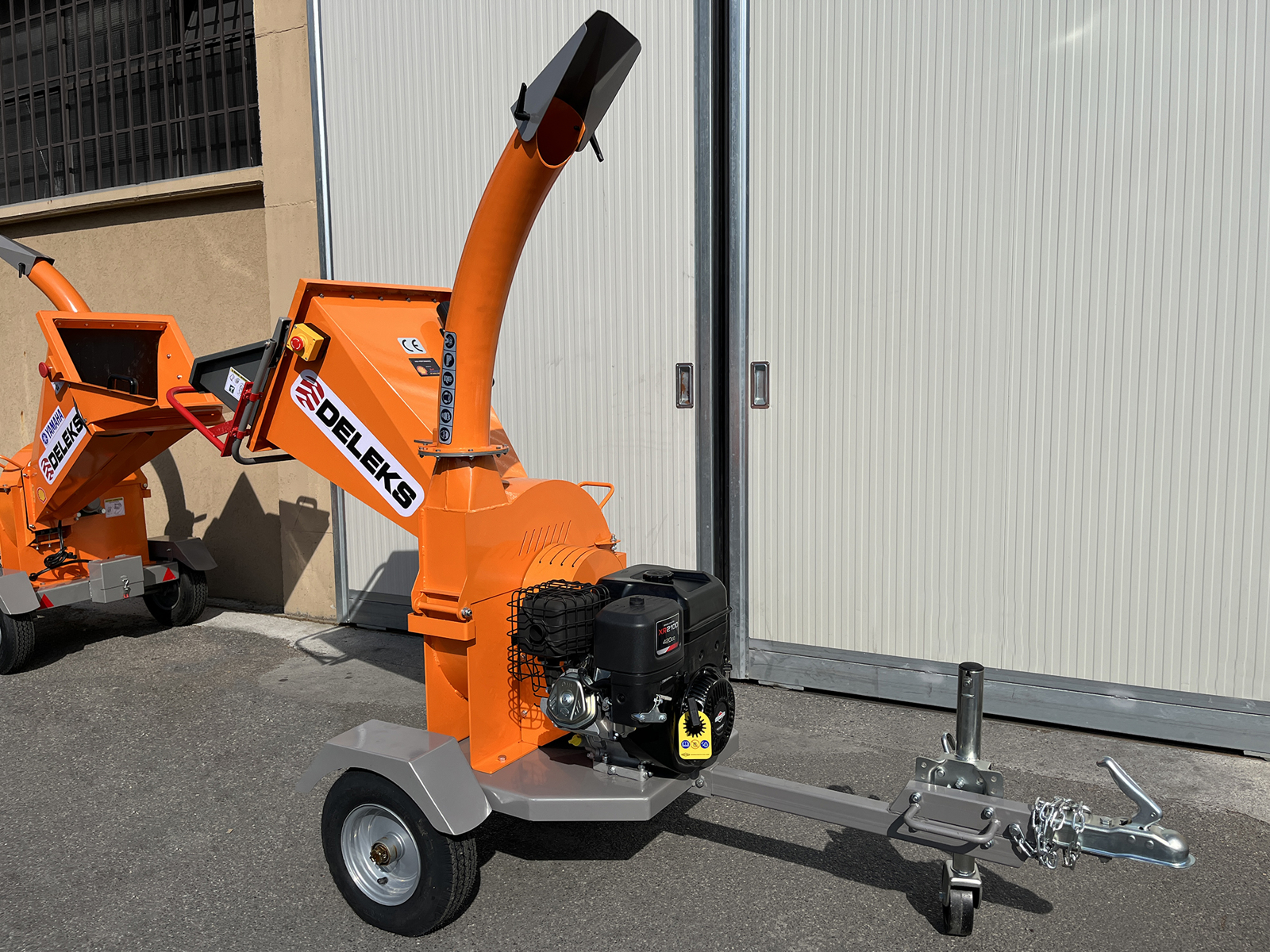 FERMERBroyeur de branches professionnel sur châssis DELEKS® DK-900 BS équipé d’un moteur essence Briggs & Stratton XR2100 de 13,5 CV avec démarrage électrique, conçu pour le broyage intensif de bois sec et vert jusqu’à 12 cm de diamètre.