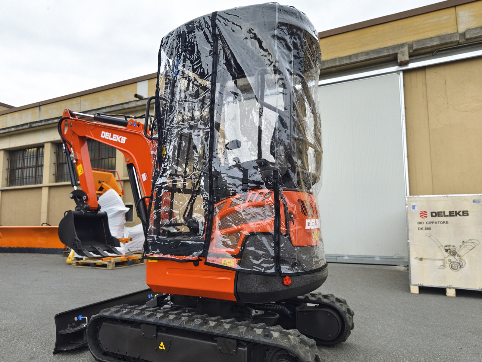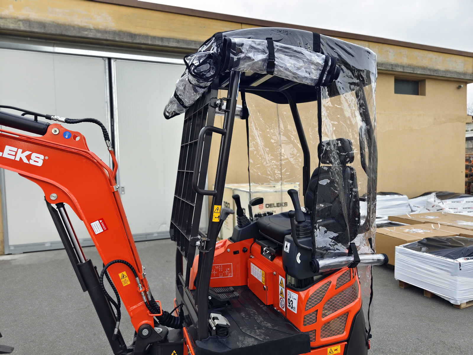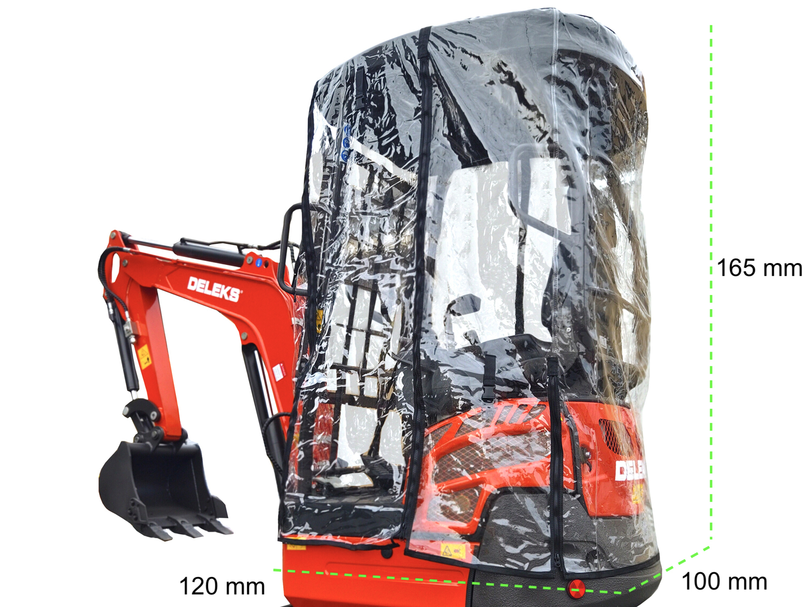 Couverture pluie / vent pour mini-pelle DELEKS® M180 - M180SE (XN18 - XN20) conçue pour ce modèle, avec portes et fenêtres.