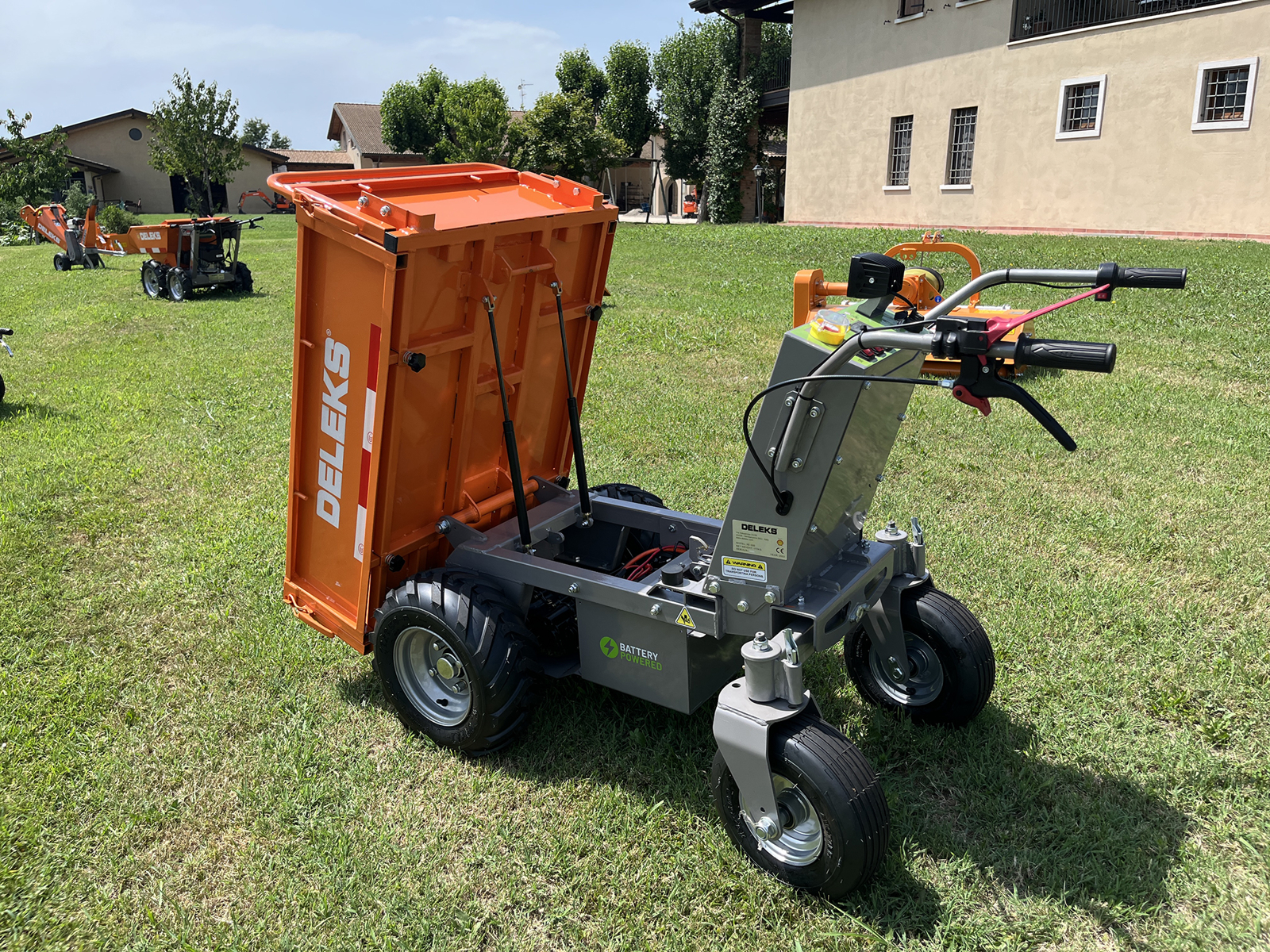 Cette brouette DELEKS® avec moteur électrique peut supporter une charge de 500 kg, elle ne fait aucun bruit, elle est donc idéale en paysagisme, construction, manèges, serres ou écuries, pour le transport de déchets, mottes, arbustes, bois, pierres, etc.