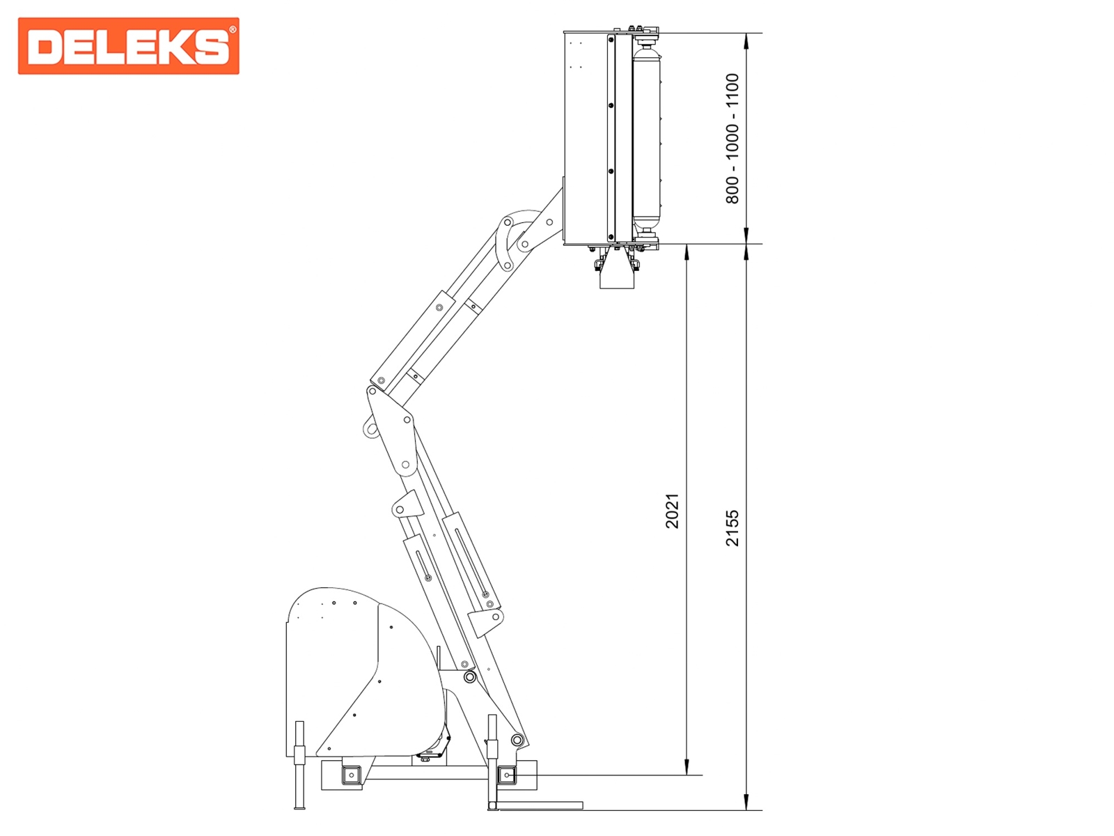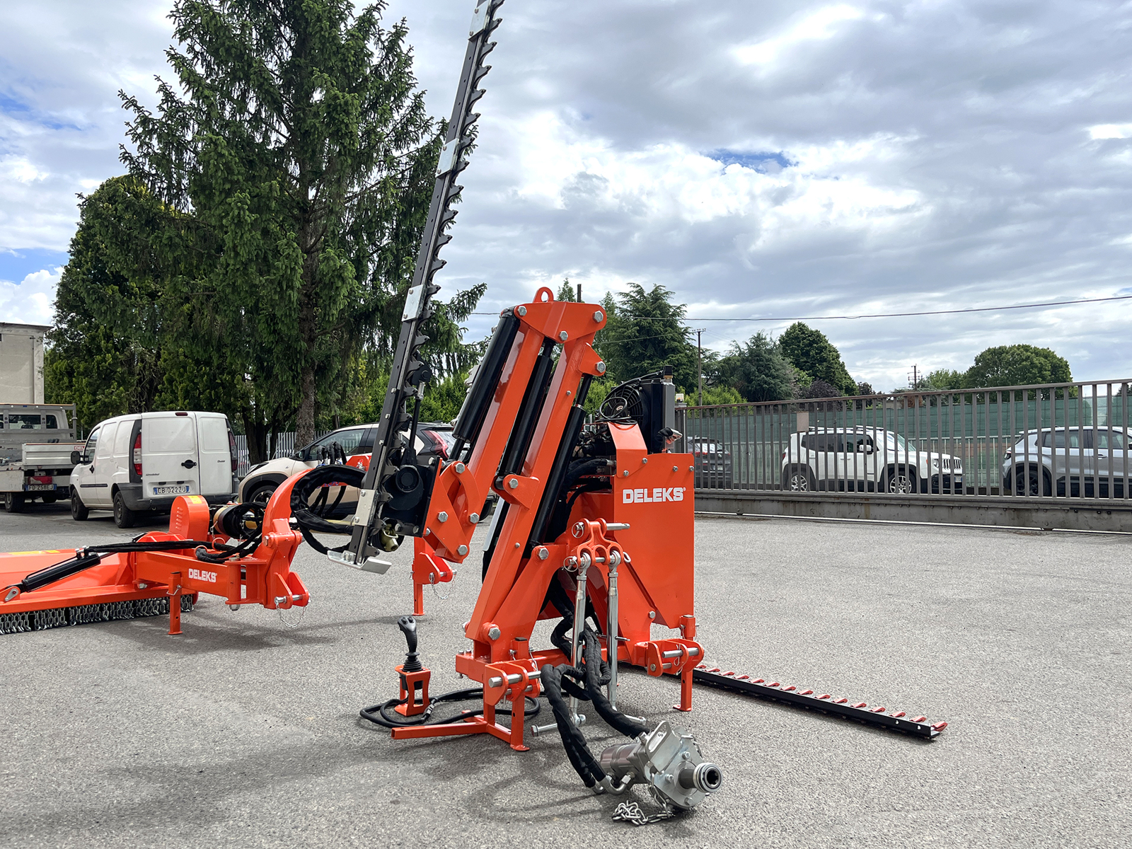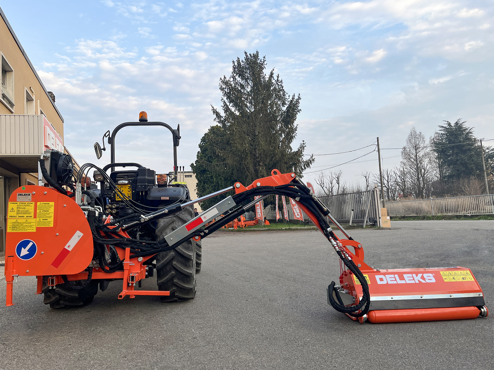 Hydraulische maaiarm - DELEKS® MERLO, kan worden uitgerust met een armklepelmaaier van 80-100-110 cm of een heggenschaar van 130-160 of 180 cm. Zijdelings gemonteerde armmaaier - Joystick.