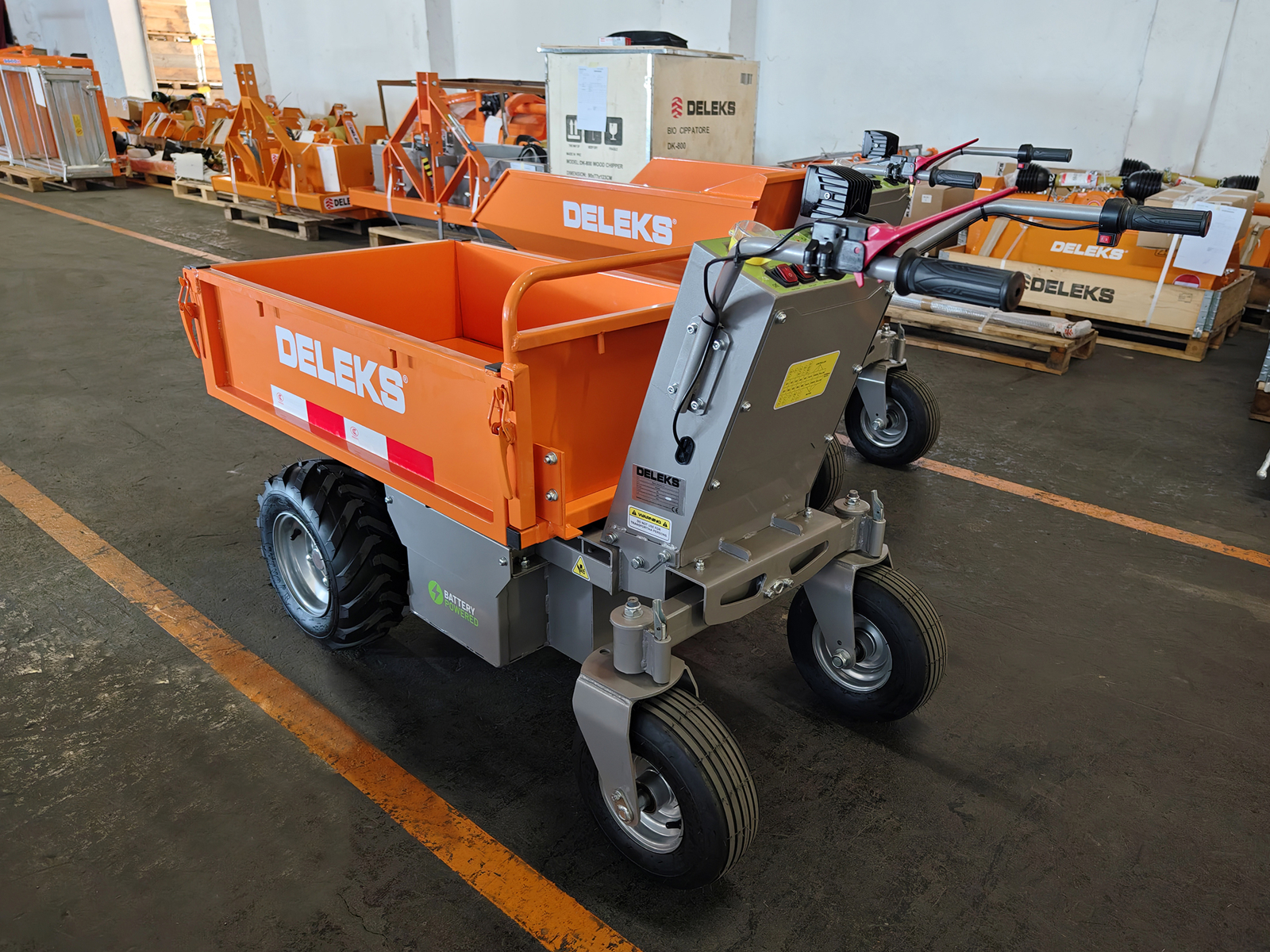 Brouette électrique DELEKS® XE500HFL Lithium avec moteur électrique 1000W 48V, batterie au lithium amovible 48V 60Ah, benne rectangulaire avec côtés extensibles et basculement hydraulique.