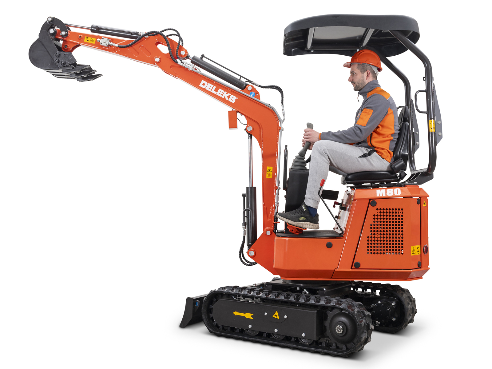 De compacte minigraafmachine DELEKS® M80 met een gewicht van 850 kg, uitgerust met een Briggs & Stratton XR2100 benzinemotor van 13,5 pk, is krachtig, stabiel en eenvoudig te bedienen.