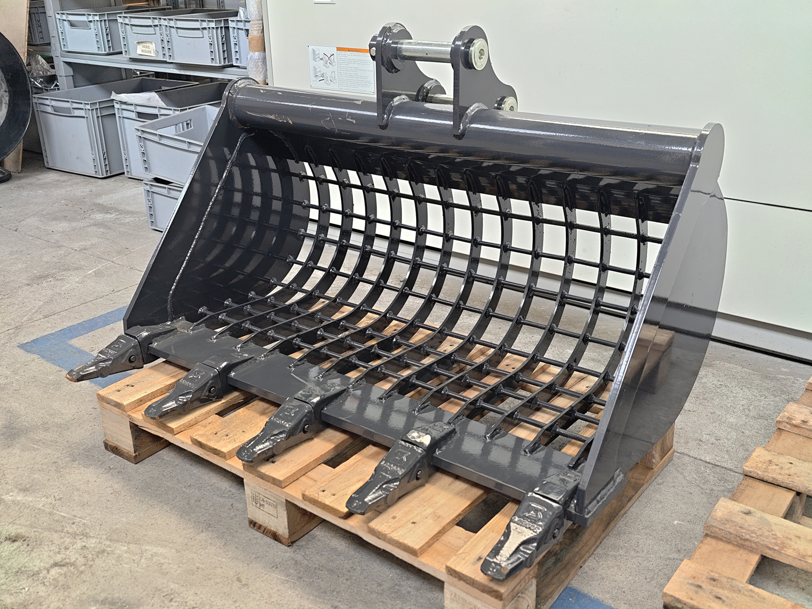 The reinforced open-grid structure, made of high-strength vertical bars, ensures excellent screening capacity and rapid discharge of fine material, reducing waste and allowing reuse of the screened soil fraction.