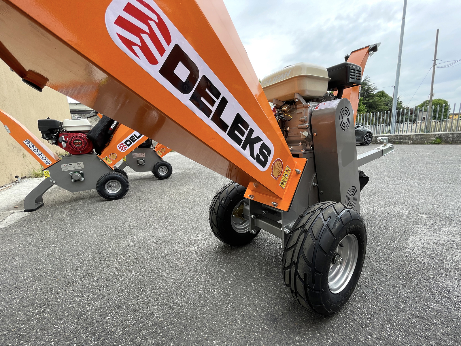 Professionele DELEKS houtversnipperaar met onafhankelijke 6,5 PK 4-takt benzinemotor. 2 omkeerbare messen van speciaal staal.