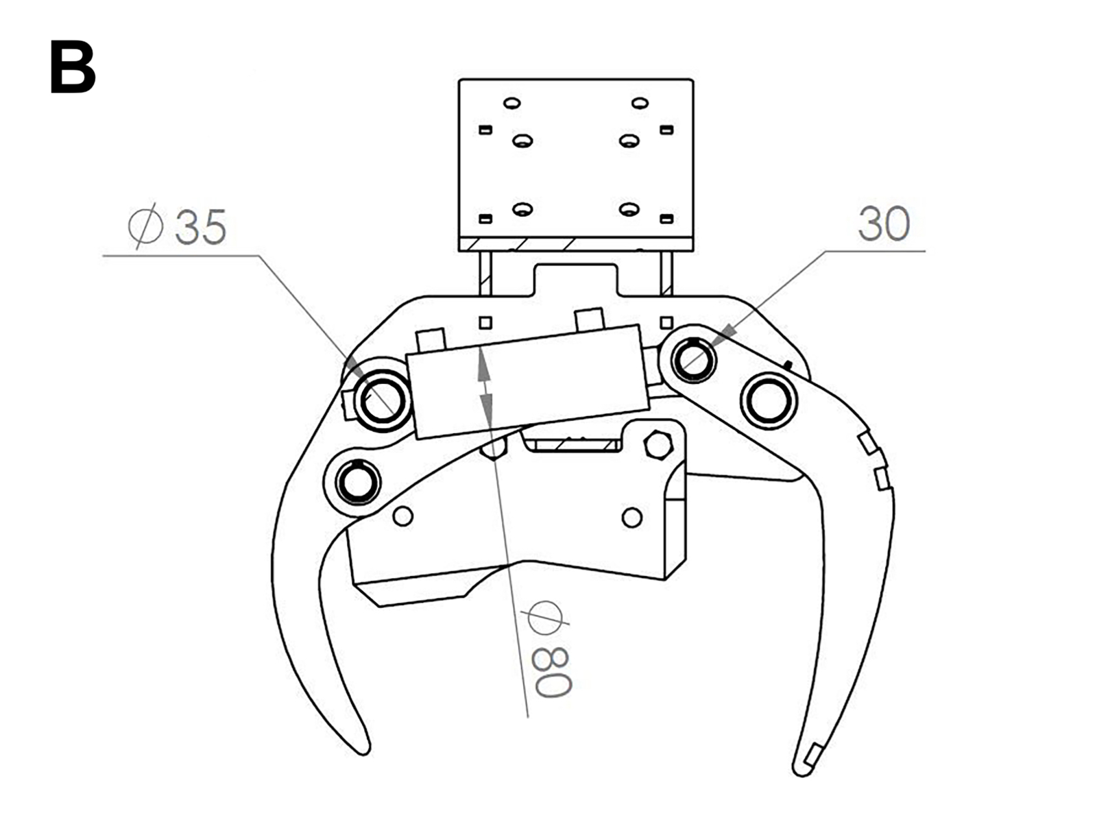 Een speciaal voor deze toepassing ontworpen hydraulische cilinder met versterkte basis voor hoge belastingen (zie tekening A).