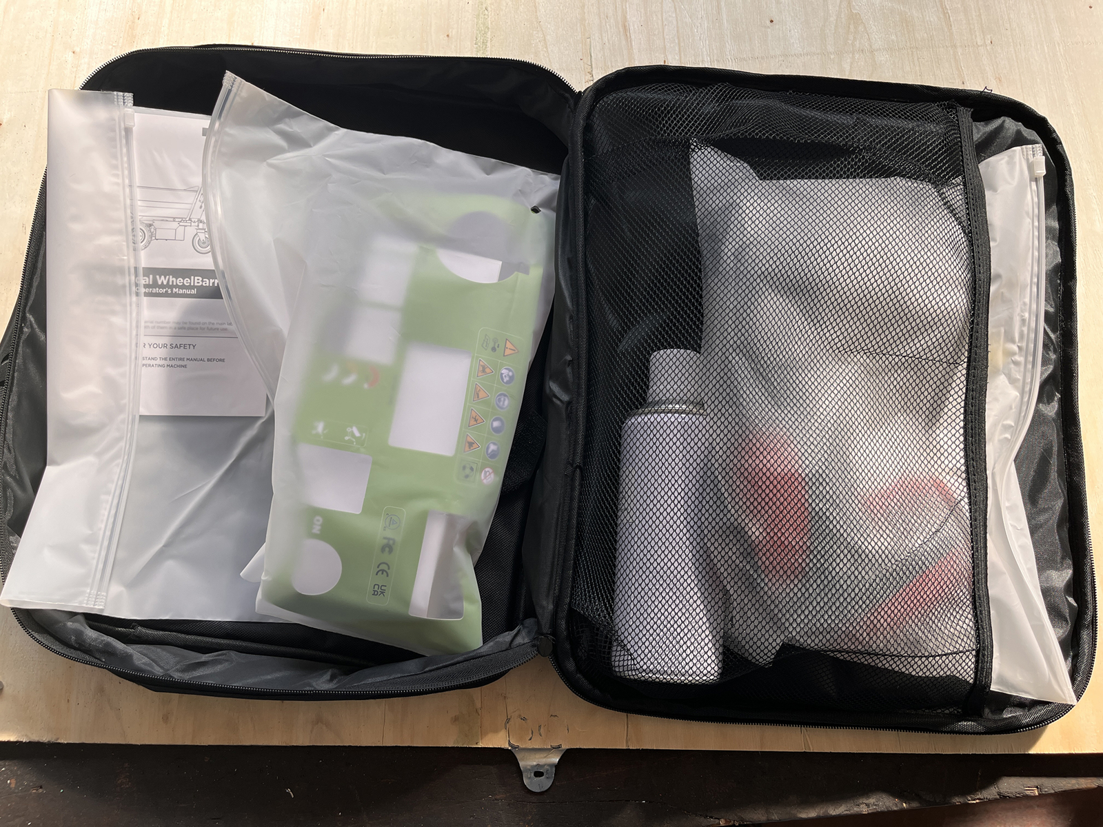 Sac avec des cadeaux offerts: autocollants de rechange, peinture en aérosol, lunettes de protection, gants de travail Deleks.