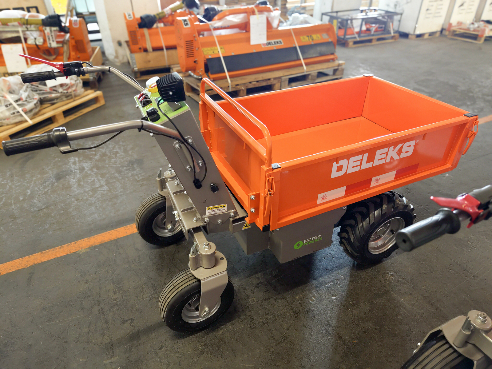 Cette brouette DELEKS® avec moteur électrique peut supporter une charge de 500 kg, elle ne fait aucun bruit, elle est donc idéale en paysagisme, construction, manèges, serres ou écuries, pour le transport de déchets, mottes, arbustes, bois, pierres, etc.